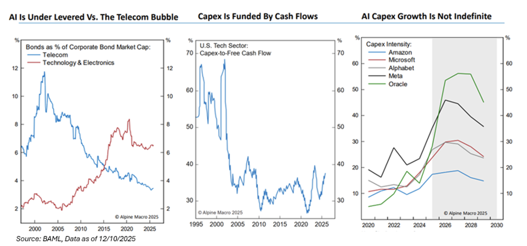 Unlike past episodes of speculative excess, today’s AI cycle is being largely financed by profitable, cash-rich firms and underpinned by robust demand. The Tech sector’s free-cash-flow margin, near 20%, is more than double its late 1990s levels, underscoring both robust profitability and capacity to self-fund AI investment. Price appreciation to this point has been primarily driven by sustained, superior earnings growth, and the dominant companies of today have particularly strong balance sheets in which the AI investments are financed by free-cash-flow. Not to mention their valuations are much lower than what we’ve witnessed in the past.