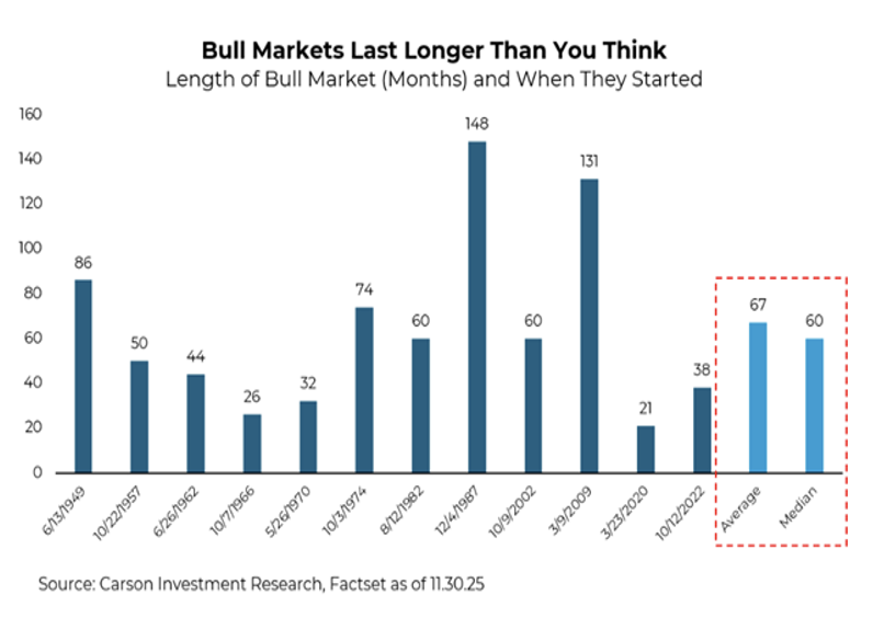 It’s likely too early to cleverly call a market top, stating that the bull market is over. In fact, looking at the 11 bull markets since World War II, the average one lasts more than five years. Not only that, the current bull market is up a very impressive 90% in just three years – which sounds like a lot – but in the context of historical rallies (the avg. bull market is +191%), perspective may state that the bull market is younger than many would think.
