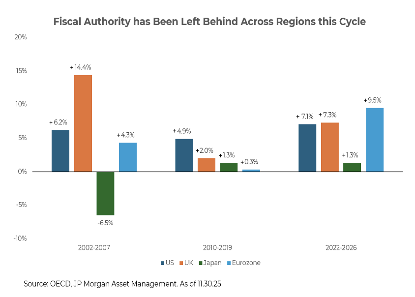 Moving forward, as the Fed cuts rates, the sensitivity impact on the government deficit will likely be as, if not more, powerful on the way down than it was on the way up; the U.S. is basically a floating rate borrower. This could be another bullish point for Fiscal policy in 2026 and beyond, as lower rates give Washington, D.C. more room in the budget to spend capital, given that it would not be used on interest expenses. With the government rarely running a surplus, there’s a high likelihood that if D.C. has dry powder, it will be spent.