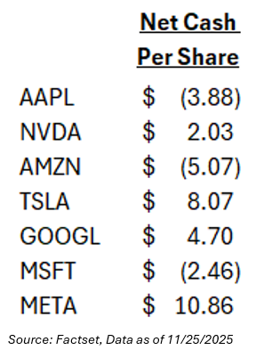 Not only that, but a lot of people don’t know that 4 of the 7 Magnificent 7 companies have positive net cash per share. They can weather some increase in debt, as their balance sheets are unencumbered.