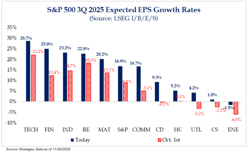 I’d actually frame the market pullback question differently – is this just (1) a rotation in flows, or (2) something more sinister lurking under the hood? I think that the Fed rate cuts and slippage in AI enthusiasm are just easy scapegoats. Personally, I think the pullback has been due to transitioning flows and lighter-than-expected liquidity in the market. Because it sure ain’t from a fundamental perspective, as you’ll see in the earnings review section below.