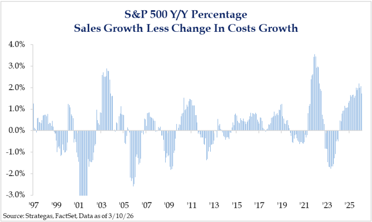 I think Strategas had a great chart that laid this narrative out perfectly. Sales growth still exceeds cost growth. This is important for margins. While the spread still stands at 1.7% today, it narrowed in February, even before the Iran war began. A spread this wide is more typically seen immediately following a recession, so its persistence mid-cycle is somewhat unusual. A further narrowing would not surprise us, but as long as the spread remains positive, it is difficult to become too negative on markets for an extended period of time.