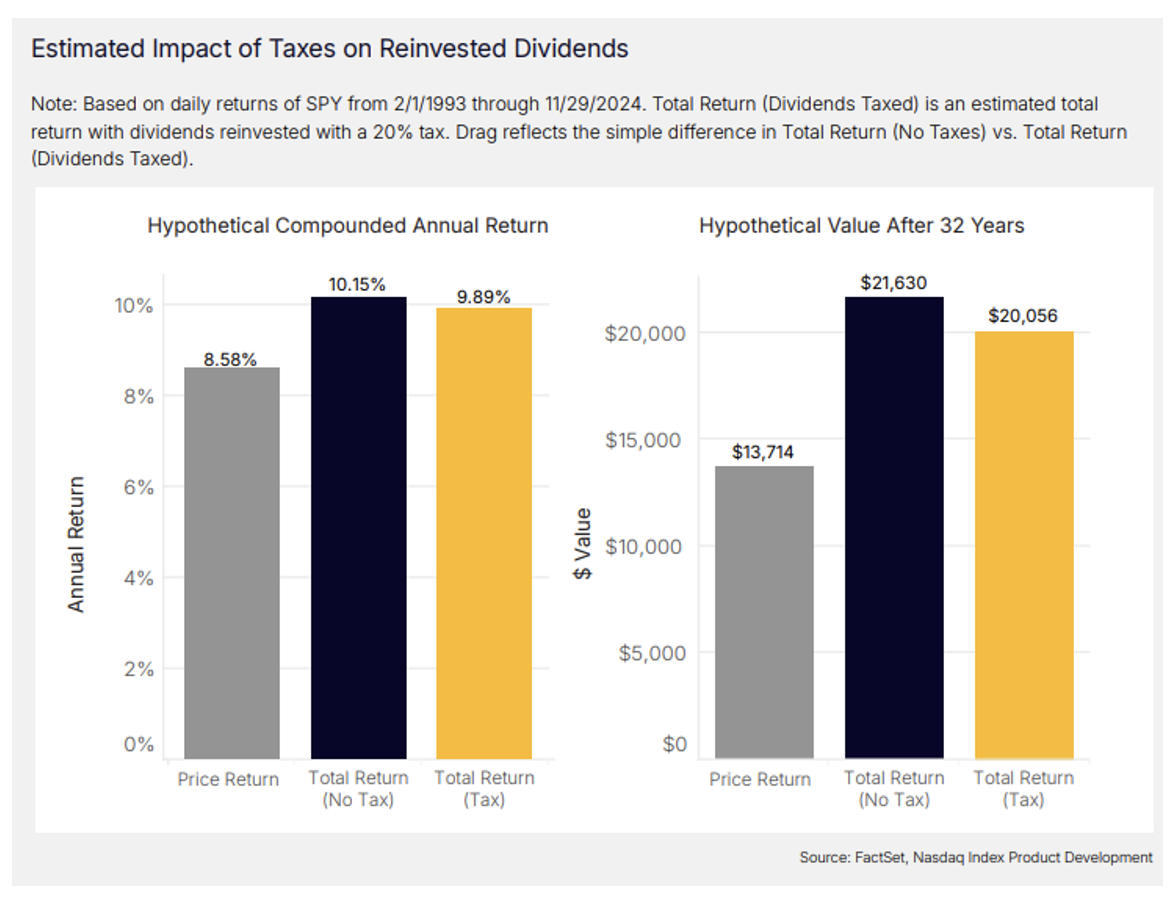 The math bears it out. A recent white paper by Nasdaq uses the S&P 500 to show that reinvesting dividends after a modest 20% tax cut annual returns by only 26 basis points over three decades, yet that seemingly small drag reduced total asset growth by 7% over a ~30-year window. In higher-yielding assets, such as fixed income, the drag can climb to 1-2% annually, whether in the form of an ETF or mutual fund. That compounding tax cost is the “residual burden” fixed ETFs have never solved.