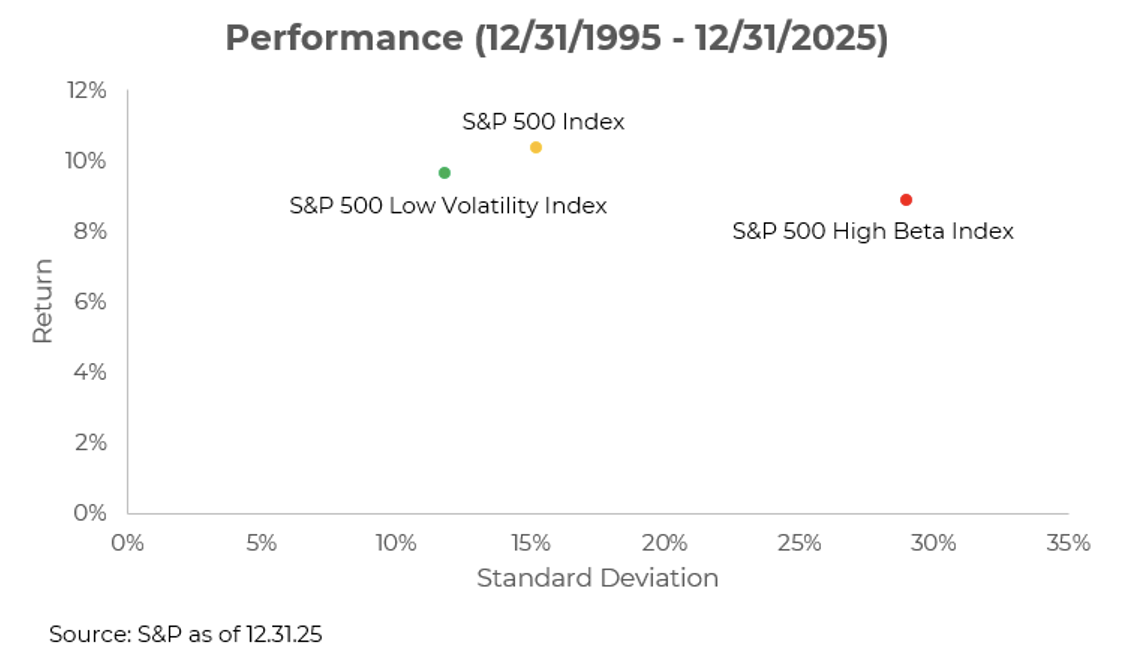 There is a persistent view that to get higher returns, you need to stomach higher volatility. The long-term data tells a different story. If you look at the last 30 years, lower volatility stocks (as defined by the S&P 500 Low Volatility Index) have achieved higher returns than high beta stocks (as defined by the S&P 500 High Beta Index) and been more closely aligned with the broader market in terms of total return.