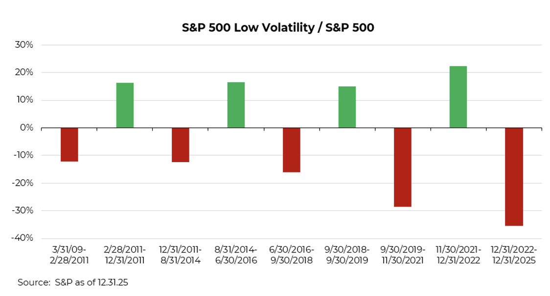 Equity markets have recently been dominated by the “Magnificent” few and a relentless bid for high-beta tech. Suggesting that lower volatility stocks can retain their documented long-term benefit feels a bit like advocating for marathon training during a 100-meter dash. It is steady and calculated, but lately, it has been left in the dust.