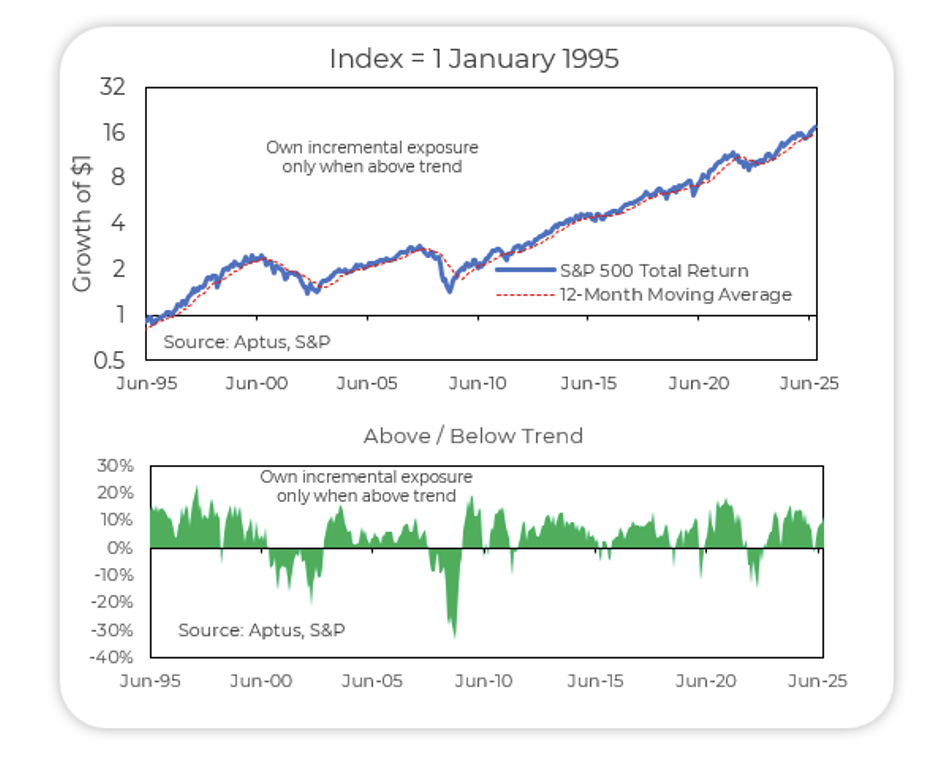 Trend is not a replacement for stocks or bonds, but a bridge between them, an element that adjusts risk in real time and keeps portfolios aligned with evolving market conditions. At Aptus, we integrate trend components across several strategies to systematically adjust exposure, capturing rising markets while improving defensiveness during drawdowns.