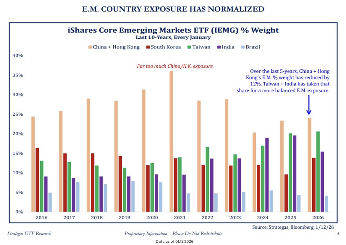 Dave: Globally, we are also seeing diversification in global markets. Emerging markets are no longer just a “China story”. In 2021, China made up over 37% of the EM index, while that is down to 25% today, with Taiwan and India picking up the lion’s share.