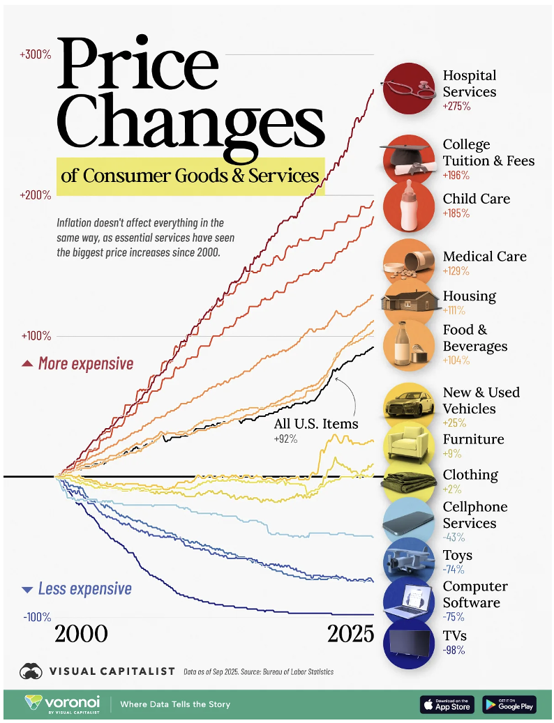 JD: That shifting wealth hasn’t necessarily made life feel cheaper, though. Price changes since 2000 show a massive decline in things that can be digitized or scaled, but a steady rise in things with finite supply or a heavy need for human services.