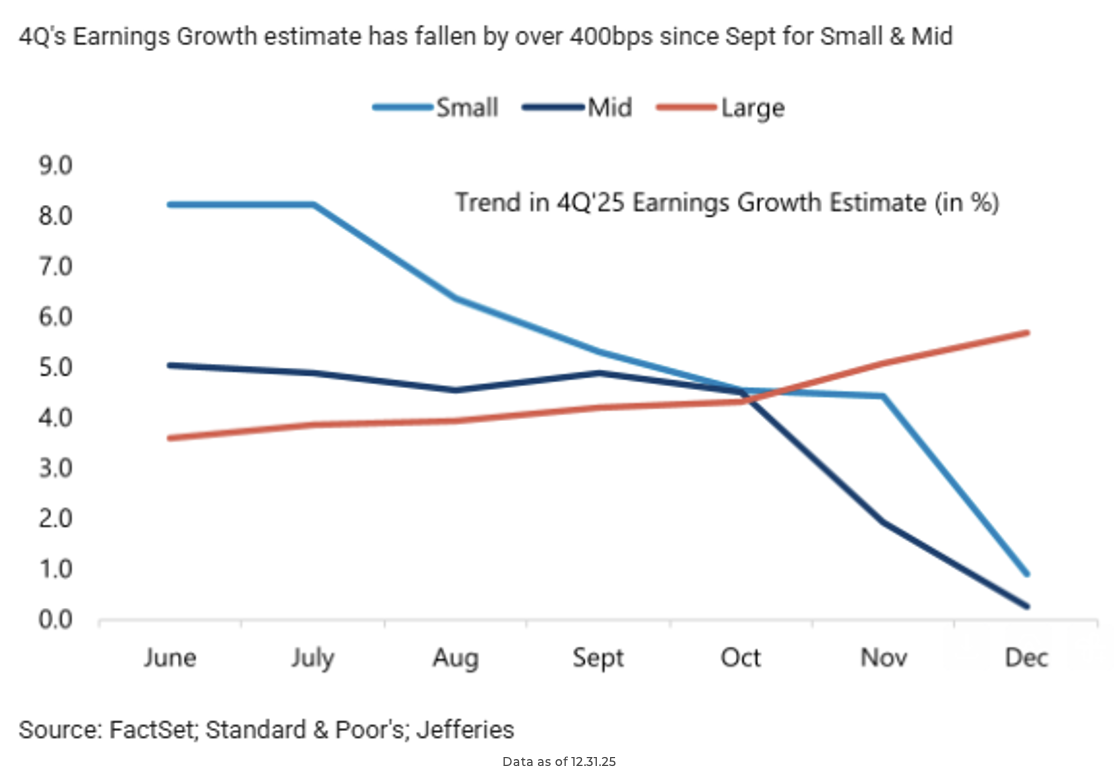 John Luke: As we pivot to the present, investor focus is shifting from macro headlines to micro fundamentals with the start of the Q4 2025 earnings season. But there is a clear “bifurcation” happening. While large-cap earnings expectations have picked up, small-cap estimates have trended lower in recent weeks.