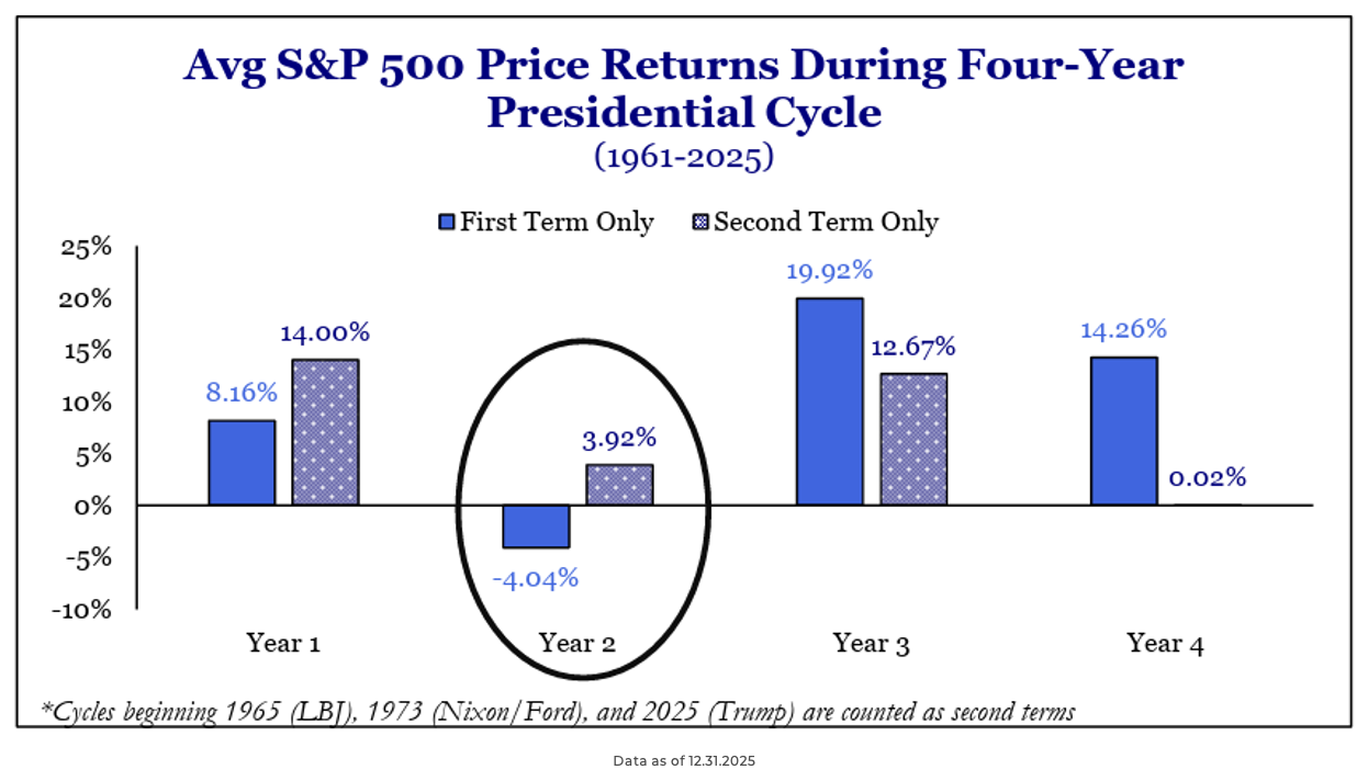 Brad: These shifts come as we move into a new phase of the political cycle. While Year 1 of a presidency is historically the best for markets due to expansive policy, Year 2 (midterm years) often brings policy friction that leads to lower historical returns.