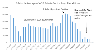 Dave: Like inflation finding a stable level near 3%, private payrolls are settling into a range just above the flatline on a monthly basis