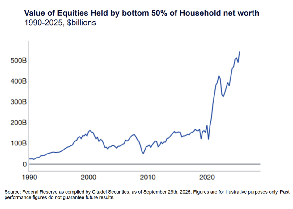 Brad: While spending among high-wealth households often draws attention, households in the bottom 50% of net worth have boosted equity exposure by more than 500% since 2020. That incremental wealth may provide additional support.