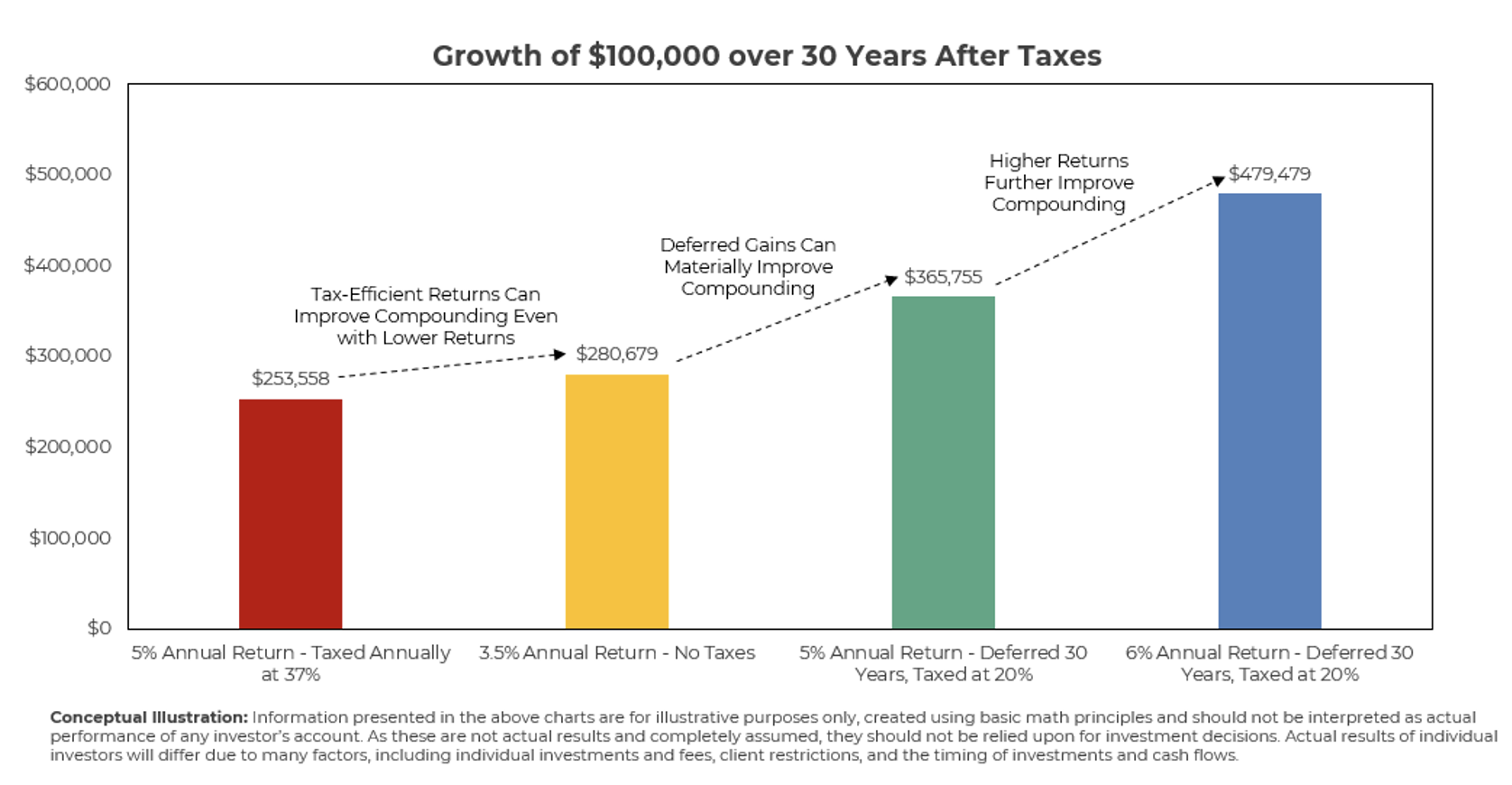 The difference between an annually-taxed 5% return and a tax-deferred 5% return over 30 years could be the difference between $253,558 and $365,755 on a $100,000 investment.