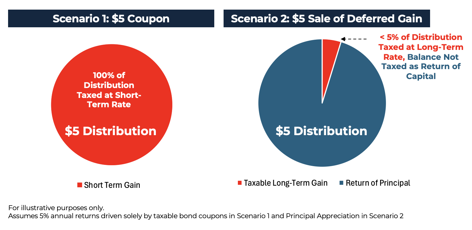 Now compare that with a strategy that produces the same 5% return, but instead of distributing income, it simply grows from $100 to $105. If the investor wants the same $5 of pre-tax cash, they sell $5 worth of the $105 position.