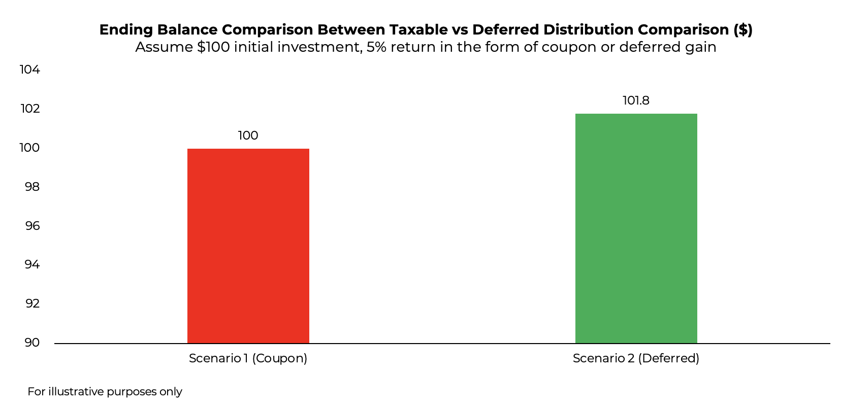 In each case, the investor earns the same return and receives the same after-tax distribution. But the deferred structure keeps an additional $1.82 in the account.