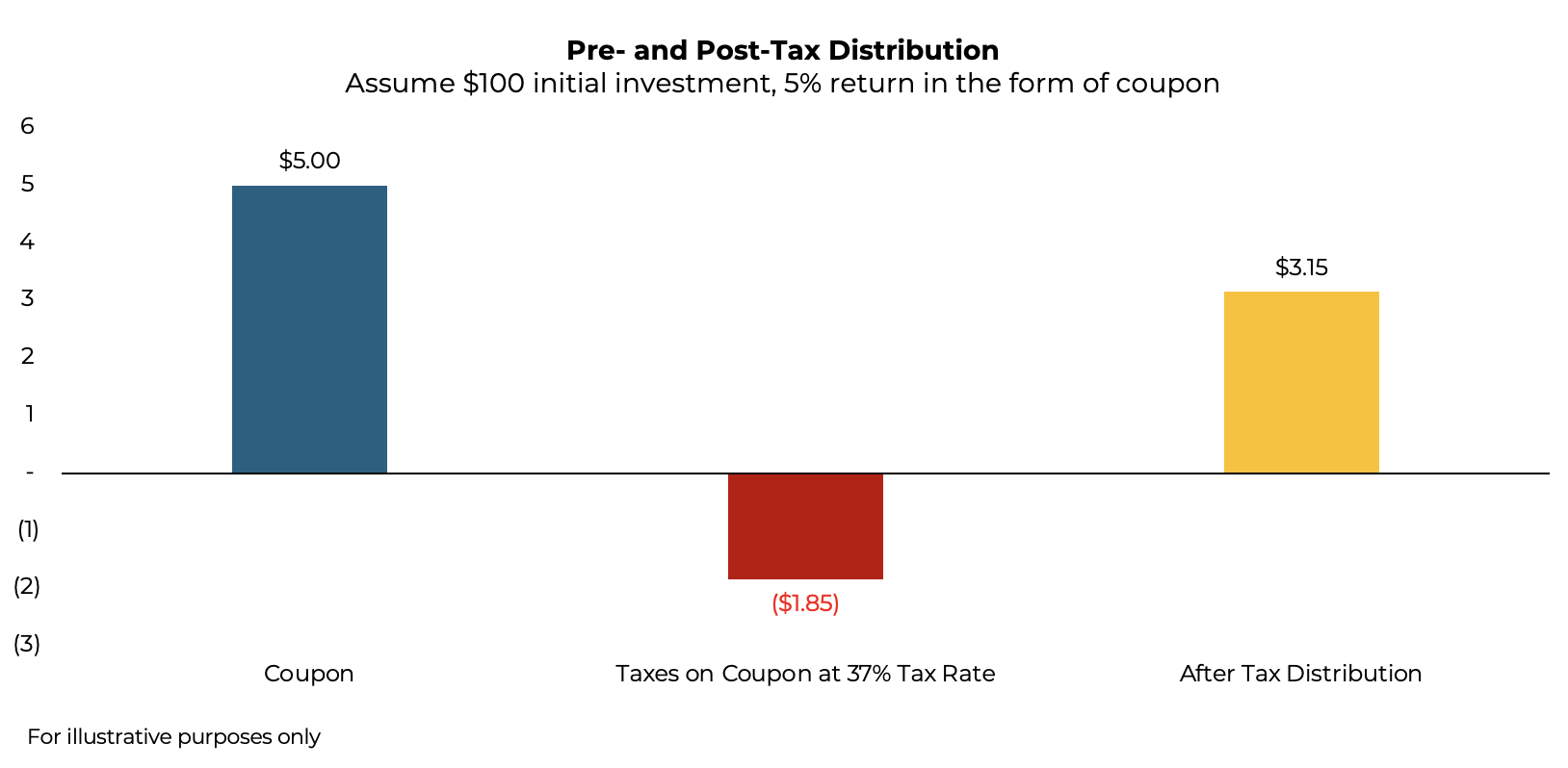 Take a bond paying a 5% coupon. For every $100 invested, the owner receives $5 of taxable income. Since bond interest is taxed at the short-term rate (assume 37%), $1.85 ($5 x 37%) of that $5 coupon goes straight to the IRS. An investor is left with $3.15 of after-tax income to reinvest or spend.